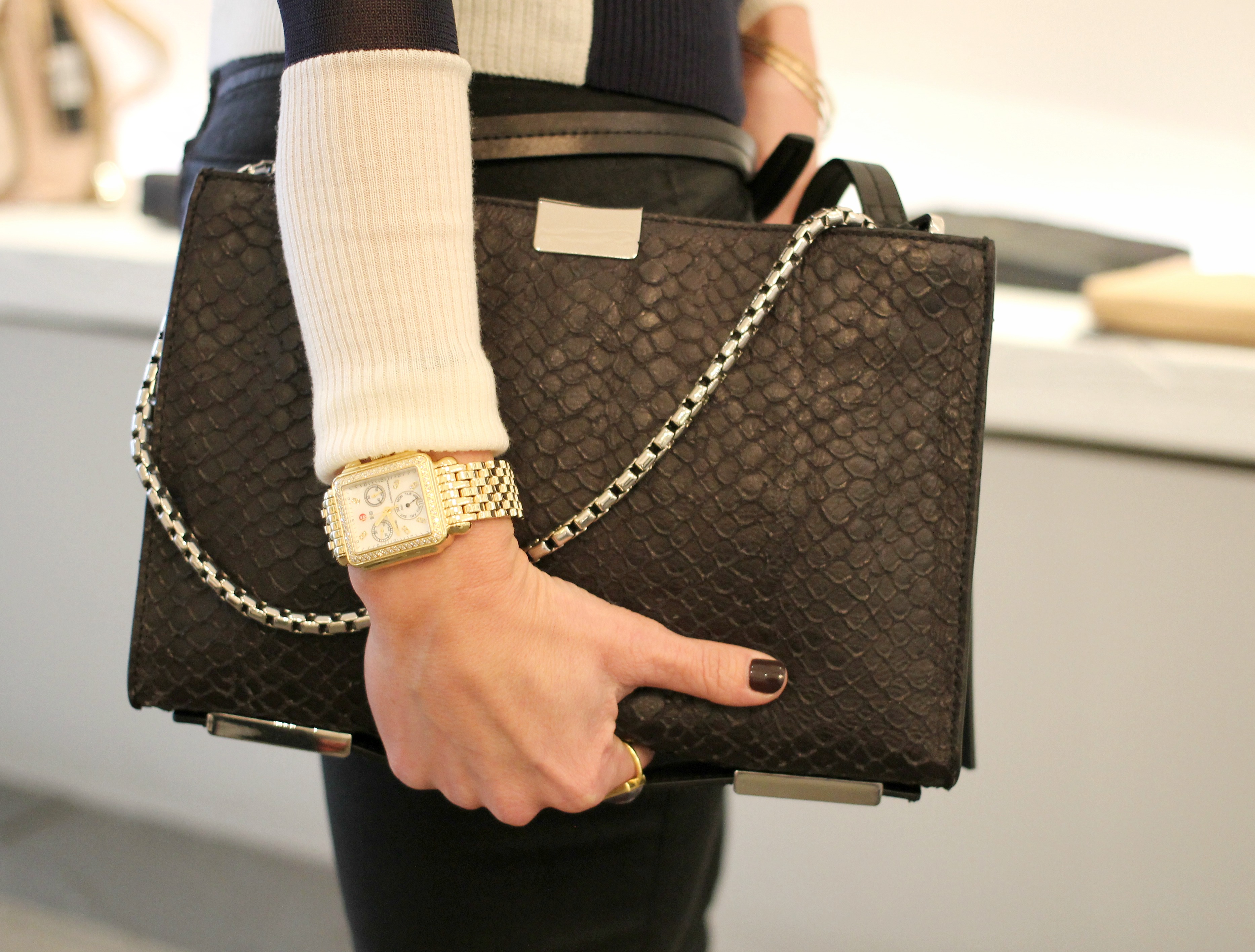Jenna – Rag & Bone Colorblock Top | Coated Denim | Valentino Wedges | Joy Gryson Tote | Lips, “boy bait”